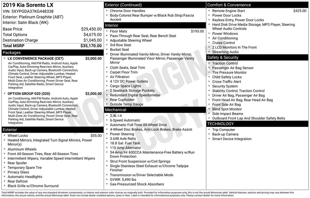 Whether you're looking for a capable family hauler, a versatile adventure companion, or a well-equipped daily driver, this 2019 Kia Sorento LX is sure to impress. With its impressive combination of features, performance, and value, this SUV is an exceptional choice that is priced to sell quickly. Don't miss your chance to experience the Sorento's exceptional blend of style, comfort, and capability â" contact us today to schedule a test drive.